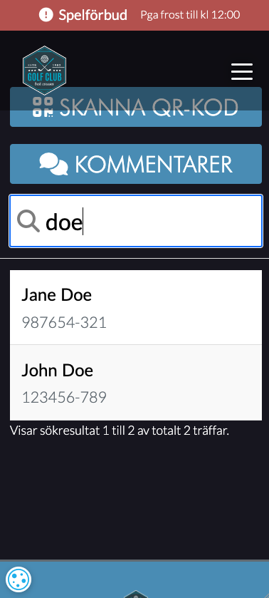 Från klubbens sida så vill man ha personer som ska kunna kontrollera medlemskortet. Det går givetvis att bara kolla direkt på golfarens telefon, men genom att tilldela personen en Kontrollant-roll i Golfinity får de fler verktyg.