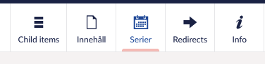 Här syns de eventuella existerande serierna som redan finns, och det finns möjlighet att lägga upp en ny serie genom att klicka på knappen "Ny serie". Vill man editera en befintlig serie klickar man på pilen till höger och väljer sedan "Redigera alla". Det går även att redigera en specifik händelse genom att klicka på den.