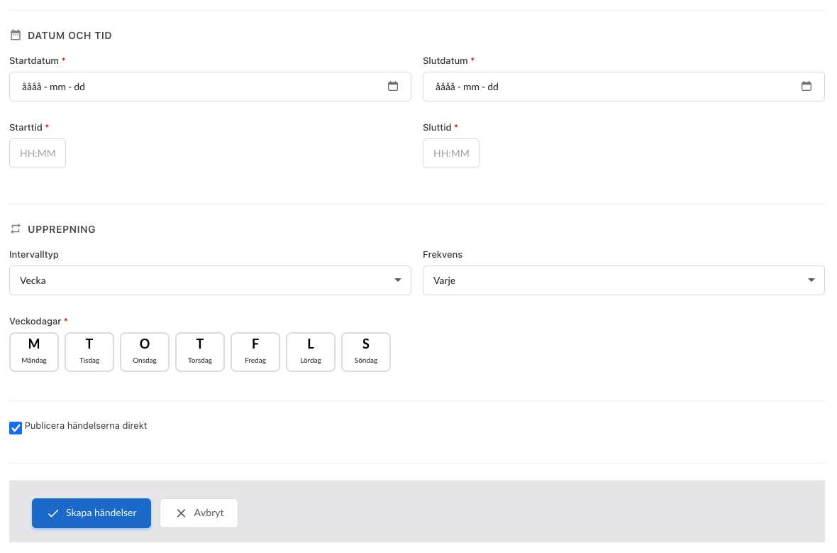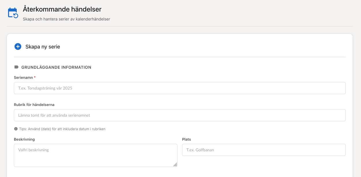 Händelser i kalendern som upprepar sig efter ett schema kan man lägga upp som en återkommande händelse. Det kan tex vara att juniorerna har träning på tisdagar och torsdagar kl 17-18 under 10 veckor, eller att det är återkommande banskötsel på onsdagar kl 06-09 under hela säsongen.