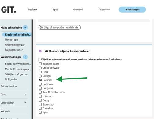 För att Golfinity ska tillåtas att hämta data får GIT, vilket görs bland annat för inloggningen för medlemmar och medlemsmatrikel så behöver klubben ge tillåtelse för Golfinity som tredjepartsleverantör i GIT-inställningar.